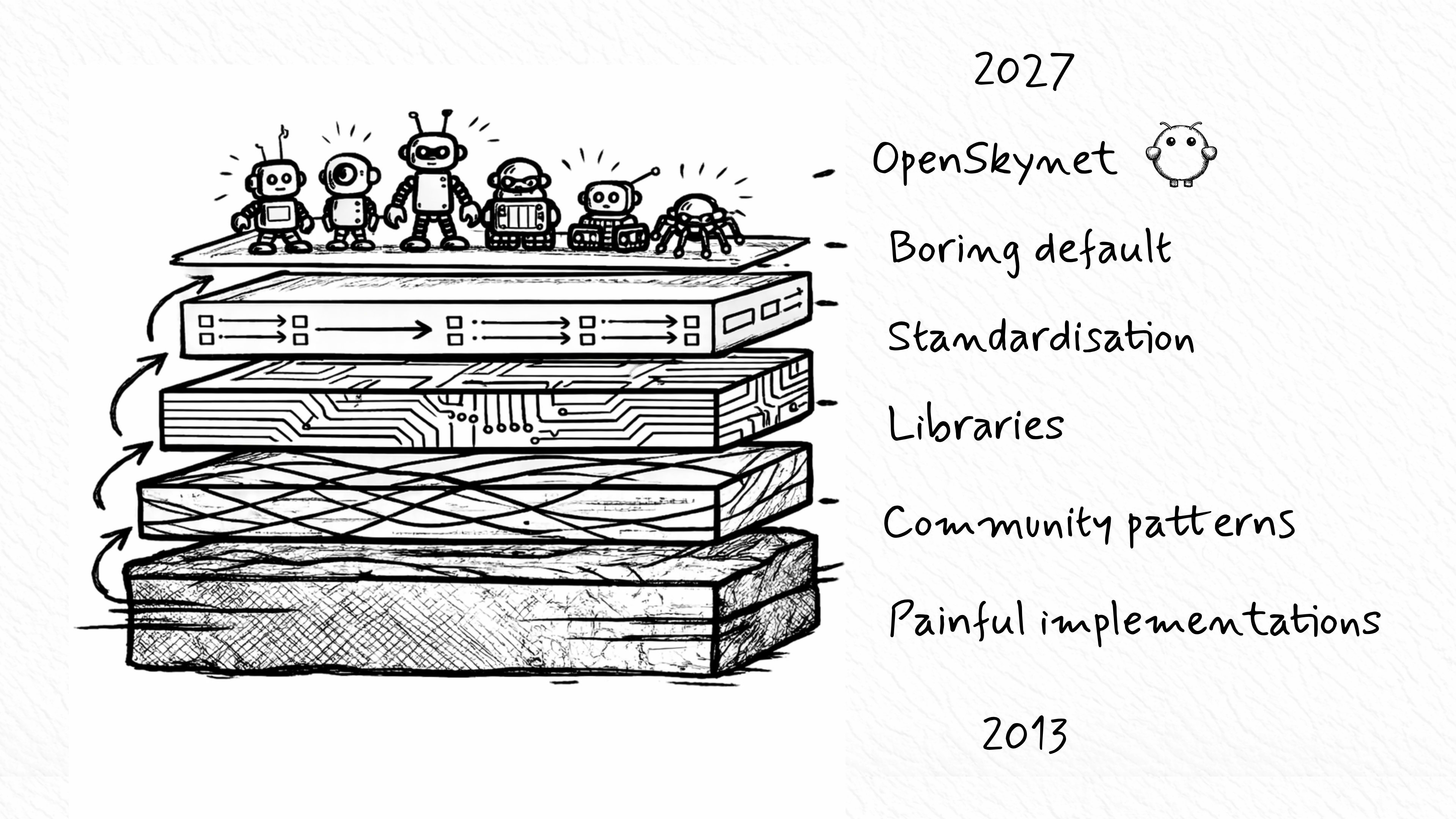The same pattern keeps repeating. Painful implementation becomes shared understanding. Shared understanding becomes a library. The library becomes a standard. The standard becomes a boring default. Then automation rises another layer and hides more of the pain.